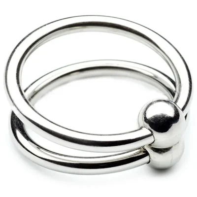 Il doppio cockring in acciaio ha misure; Anelli in acciaio da 28 mm di diametro e sfera di unione larga 10 mm.